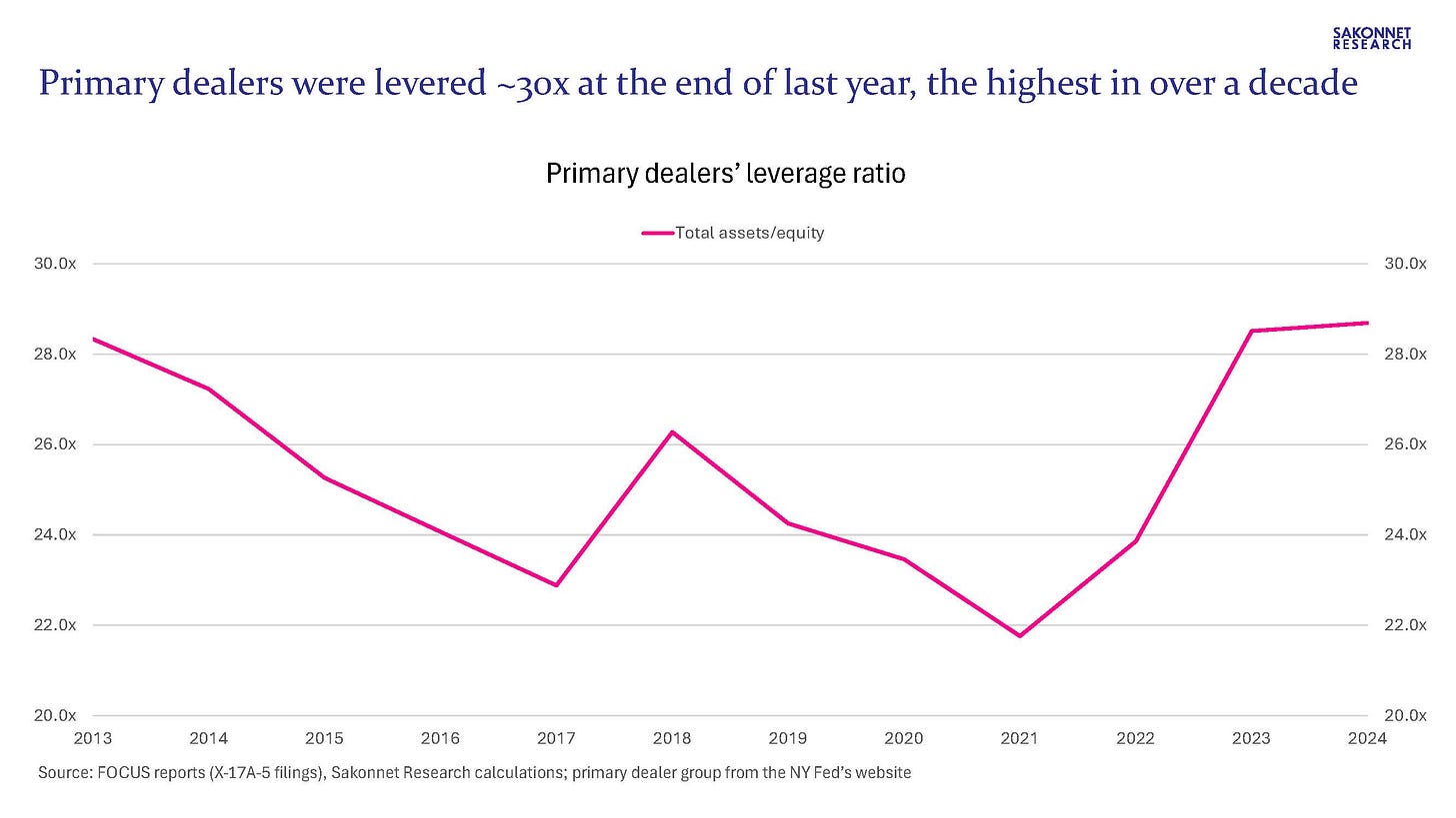 And as I’ve pointed out before, primary dealers themselves were levered around 30 times (assets/equity) at the end of last year, the highest level in over a decade.