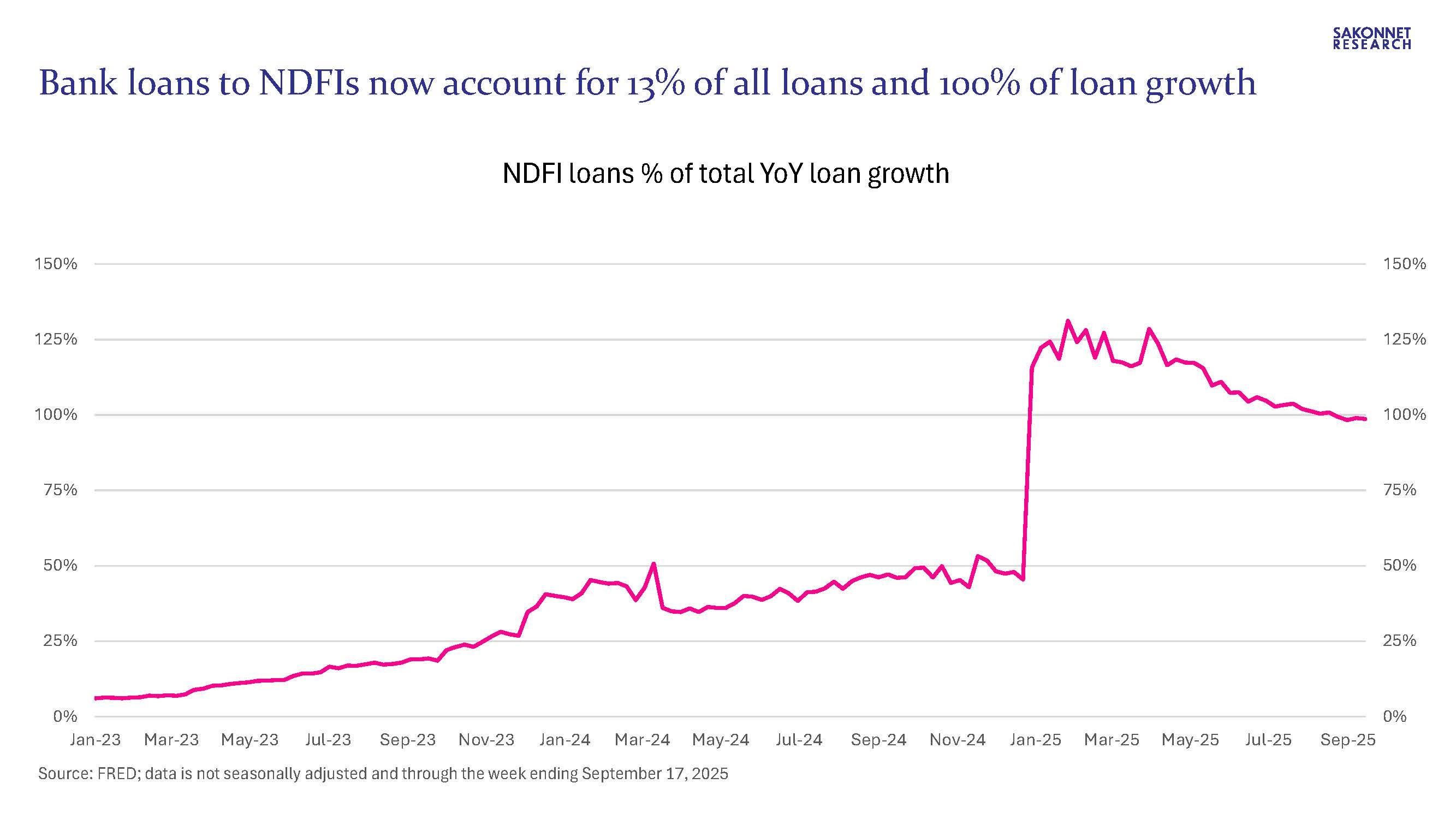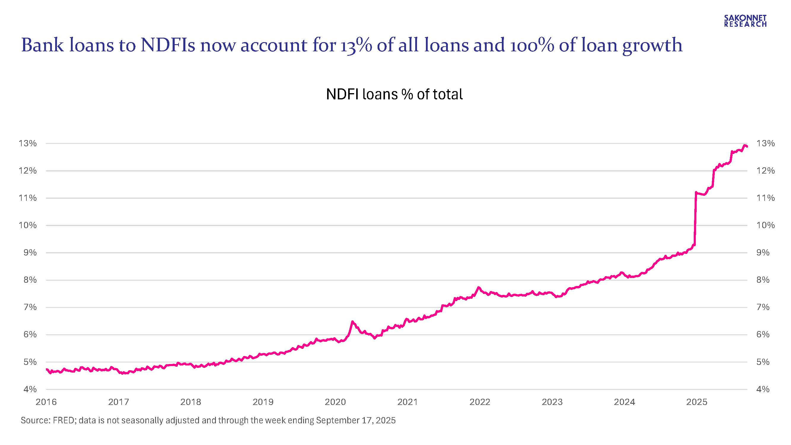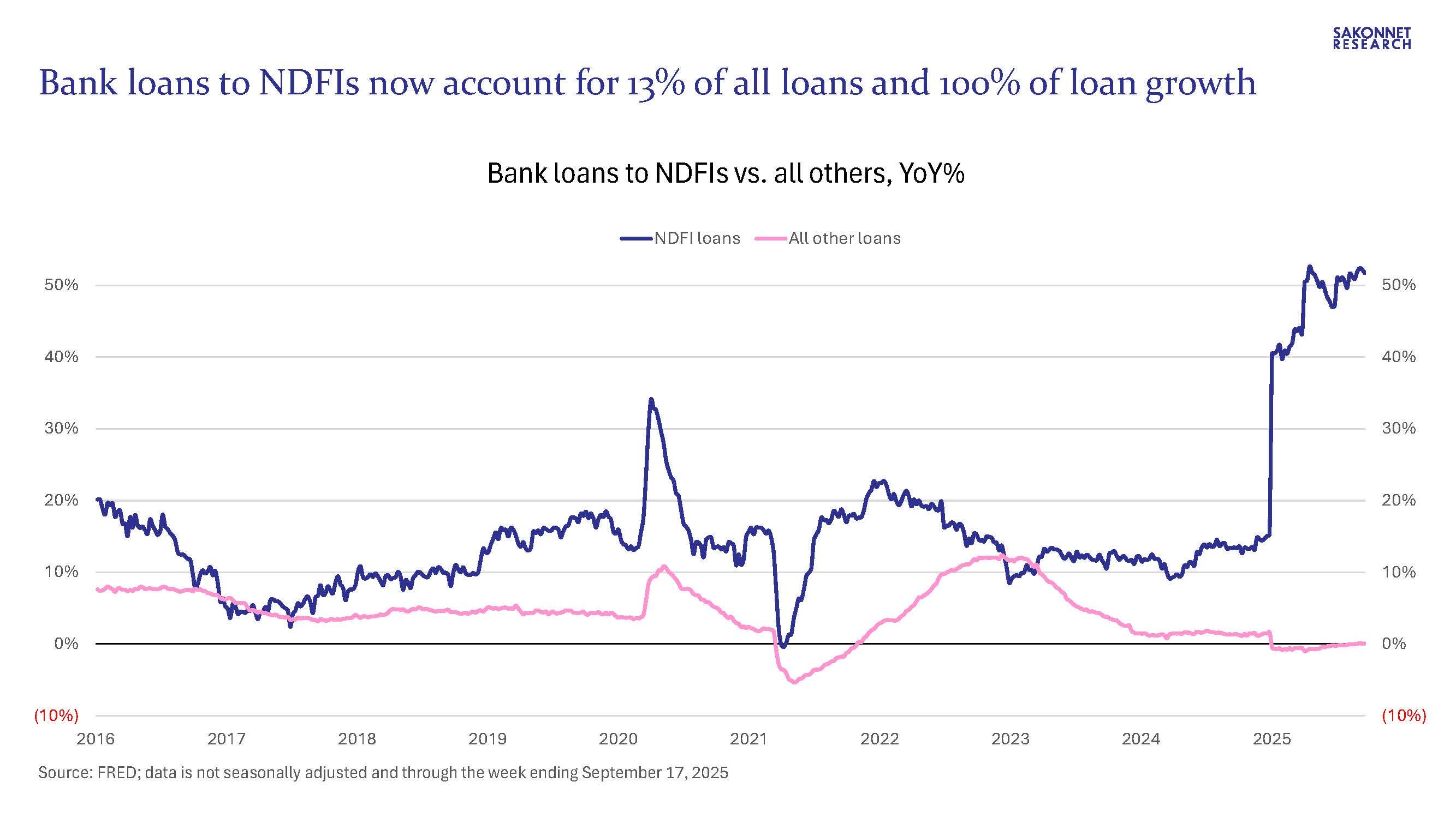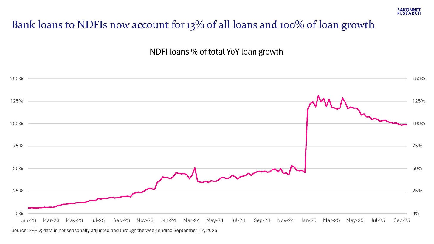 We already knew NDFI lending was booming: it had grown from $300 billion in 2016 to $1.4 trillion as of June 30, 2025 per call report data, accounting for nearly 11% of total loans. But it’s even bigger than that. Much bigger. In yesterday’s H.8 release (Assets and Liabilities of Commercial Banks in the United States), the Federal Reserve made substantial revisions to historical loan data, resulting in ~$340 billion higher NDFI loans and equivalent lower loans in other categories (including ~$170 billion lower commercial and industrial (C&I) loans and ~$150 billion lower consumer loans). As a result, bank lending other than to NDFIs has in fact declined this year (by 0.4%), and NDFI loans now account for 13% of all loans and are nearly two-thirds the size of C&I loans.